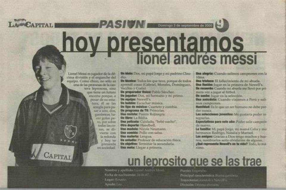 En Argentine, certains ont récupéré ce qui pourrait être la première interview dans un journal de Lionel Messi. C’était le 3 septembre 2000, dans le supplément « Passion rojinegra » des journaux « La Capitale » de Rosario, sa ville natale. Messi avait alors 13 ans.